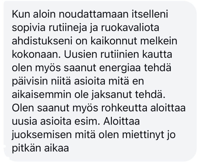Olen valmentanut jo lähes 200 upeaa naista kohti harmoniaa ja elinvoimasta elämää. Alla muutamia asiakkaideni kokemuksia. Ehkä sinä olet seuraava?