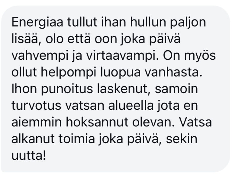 ” Olen saanut mitä tavoittelin, ja enemmän. Elämä tuntuu selkeämmältä (vähemmän aivosumua), ja osaan itse kuulostella omaa oloa paremmin, ja sitten reagoida ja muuttaa tarvittavia asioita jos sille on tarvetta. Esim. allergiasesongin oireilut 90% poissa nyt.”